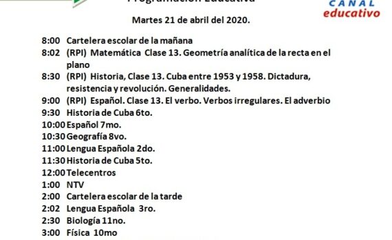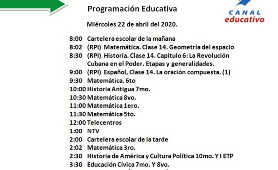 Jueves 23 de abril del 2020. 8:00 Cartelera escolar de la mañana 8:02 (RPI) Matemática. Clase 15. Geometría del espacio y cálculo de cuerpo 8:30 (RPI) Historia. Clase 15. Generalidades del programa y sugerencias para el examen de ingreso. 9:00 (RPI) Español, Clase 15. La oración compuesta. Parte 2 […]